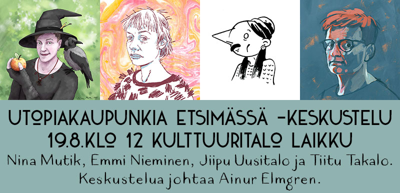 Järjestämme näyttelyn avautuessa Kulttuuritalo Laikun auditoriossa paneelikeskustelun galleriassa esillä olevista teoksista ja niiden synnystä, utopiakaupungeista ja kaupunkia pienempien utopioiden rakentamisesta. Mukana näyttelyn taiteilijat Nina Mutik, Emmi Nieminen ja Jiipu Uusitalo sekä näyttelyn kuraattori Tiitu Takalo. Keskustelua johtaa historiantutkija Ainur Elmgren.